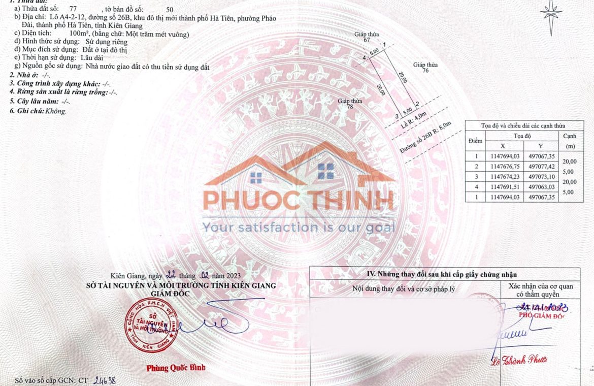 Nền A4-2-12  tọa lạc tại đường số 26B R:8m thuộc khu Hà Tiên Centroria trong Khu đô thị mới Hà Tiên, phường Pháo Đài, thành phố Hà Tiên, tỉnh Kiên Giang.