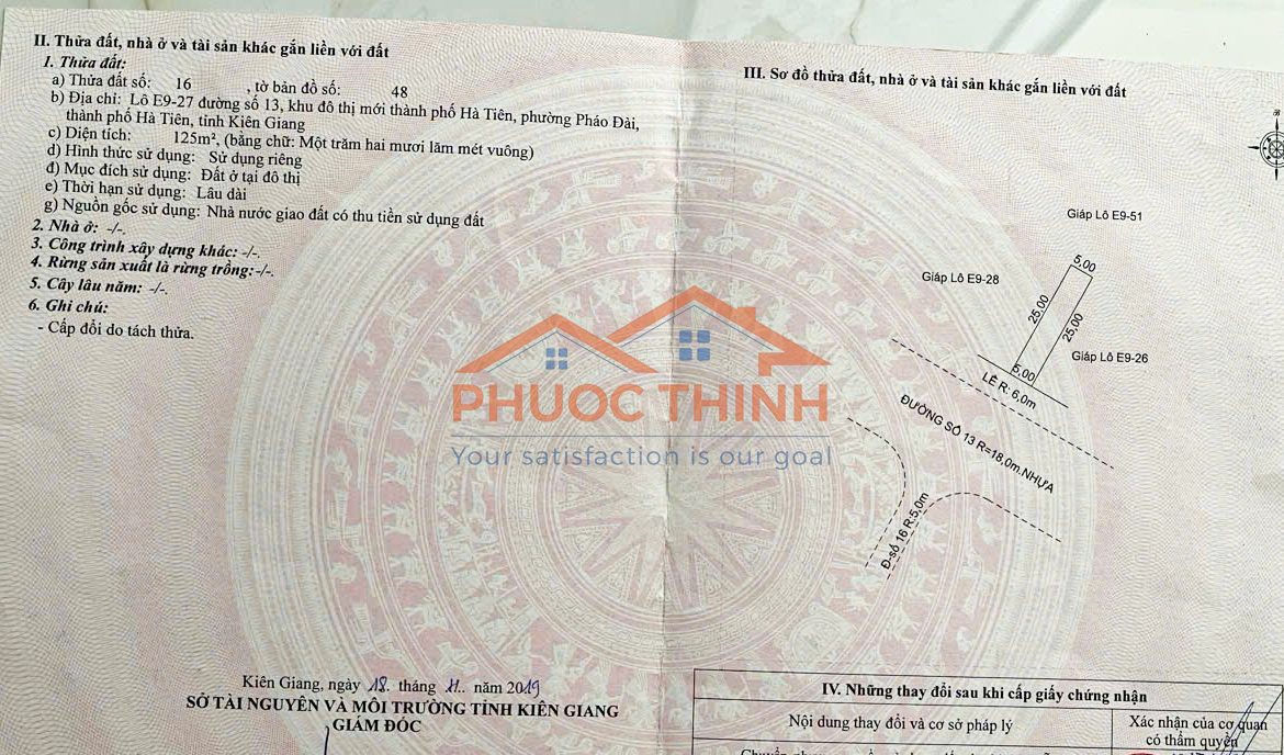 Tuyến đường Lê Lợi là một trong những trục đường nội đô đẹp và quy hoạch bài bản bậc nhất khu đô thị mới Hà Tiên – Nền đất E9-27 sở hữu vị trí vô cùng lý tưởng để xây dựng nhà ở, nghỉ dưỡng hoặc đầu tư lâu dài. Với diện tích 5m x 25m, lô đất có hình dáng vuông vức, mặt tiền rộng, dễ dàng thiết kế xây dựng theo nhiều phong cách. Hướng đất thông thoáng, đón nắng và gió tự nhiên, tạo cảm giác dễ chịu và gần gũi với thiên nhiên.