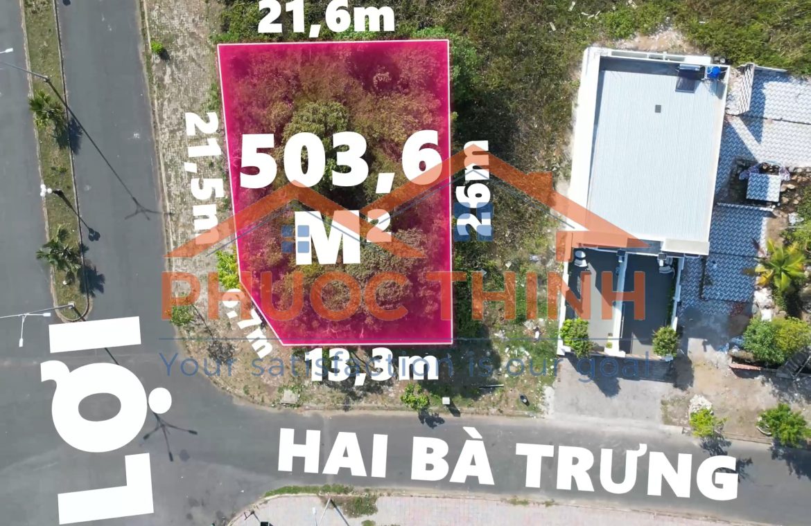 Nền đất có tổng diện tích 503,6 m², với hình dáng cân đối tạo nên một quỹ đất rộng rãi và dễ dàng bố trí nhiều loại hình công trình khác nhau. Với lợi thế góc hai mặt tiền đường, không gian xung quanh luôn thông thoáng, thuận tiện cho việc thiết kế nhà ở, biệt thự sân vườn hoặc các mô hình kinh doanh dịch vụ.