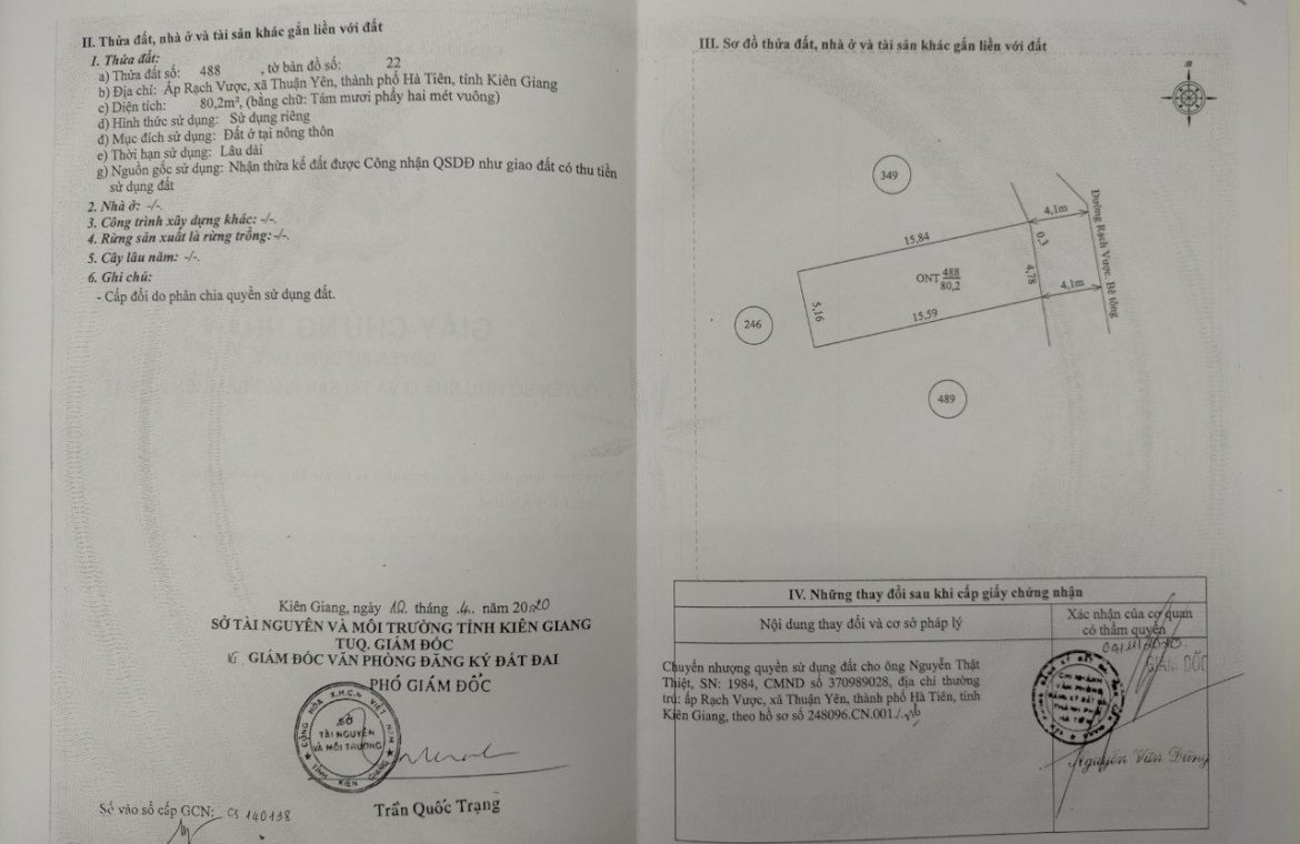 Thửa đất thuộc ấp Rạch Vược, xã Thuận Yên, thành phố Hà Tiên, tỉnh Kiên Giang. Hướng Đông Bắc